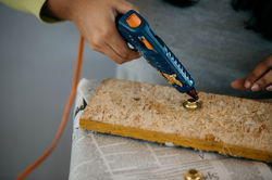 Place a ring of hot glue around the insides of the grommets and insert them into the previously made holes.
