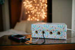 Use the large opening on the end side for an extension cord and the holes with grommets on the long side for individual charger cords.